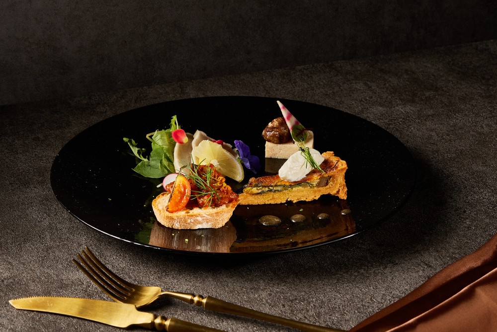 アミューズ / 秋刀魚のブルスケッタ 鬢長鮪のタタキ レモン風味 きのこのタルト 鶏肉とモリーユ茸のテリーヌ