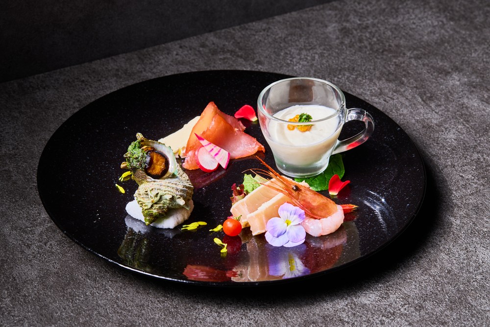 アミューズ / 鮪の生ハム 本日のチーズとともに 栄螺のブルギニオンバター焼き 桜燻し鬢長のタタキと甘海老のカルパッチョ仕立て 新玉葱ムース 雲丹をのせて