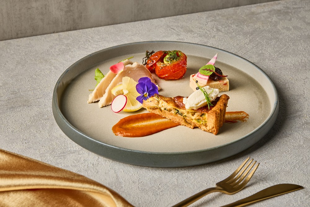 アミューズ / 鬢長鮪のタタキ レモン風味 小柱のミディトマトファルシ きのこのタルト 鶏肉とモリ―ユ茸のテリーヌ