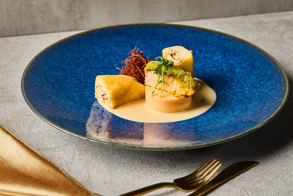 メイン / 秋刀魚のクレープ巻きと秋鮭のペルシャード 雲丹のテリーヌ添え 醤油クリームソースにて